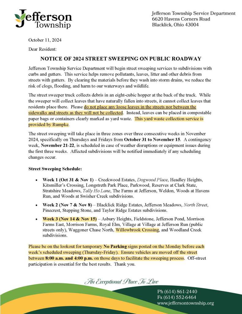 Franklin (County) Soil & Water Conservation District (FSWCD) and the Jefferson Township Elected Officials have chosen prepare an Ohio EPA stream restoration grant application to improve the water quality of the stream that runs throughout Willow Brook Crossing subdivision (parcels 171-000769, 171-000709 and 171-00077 township-owned open space) that the HOA and residents of Willow Brooke Crossing maintain via HOA dues.